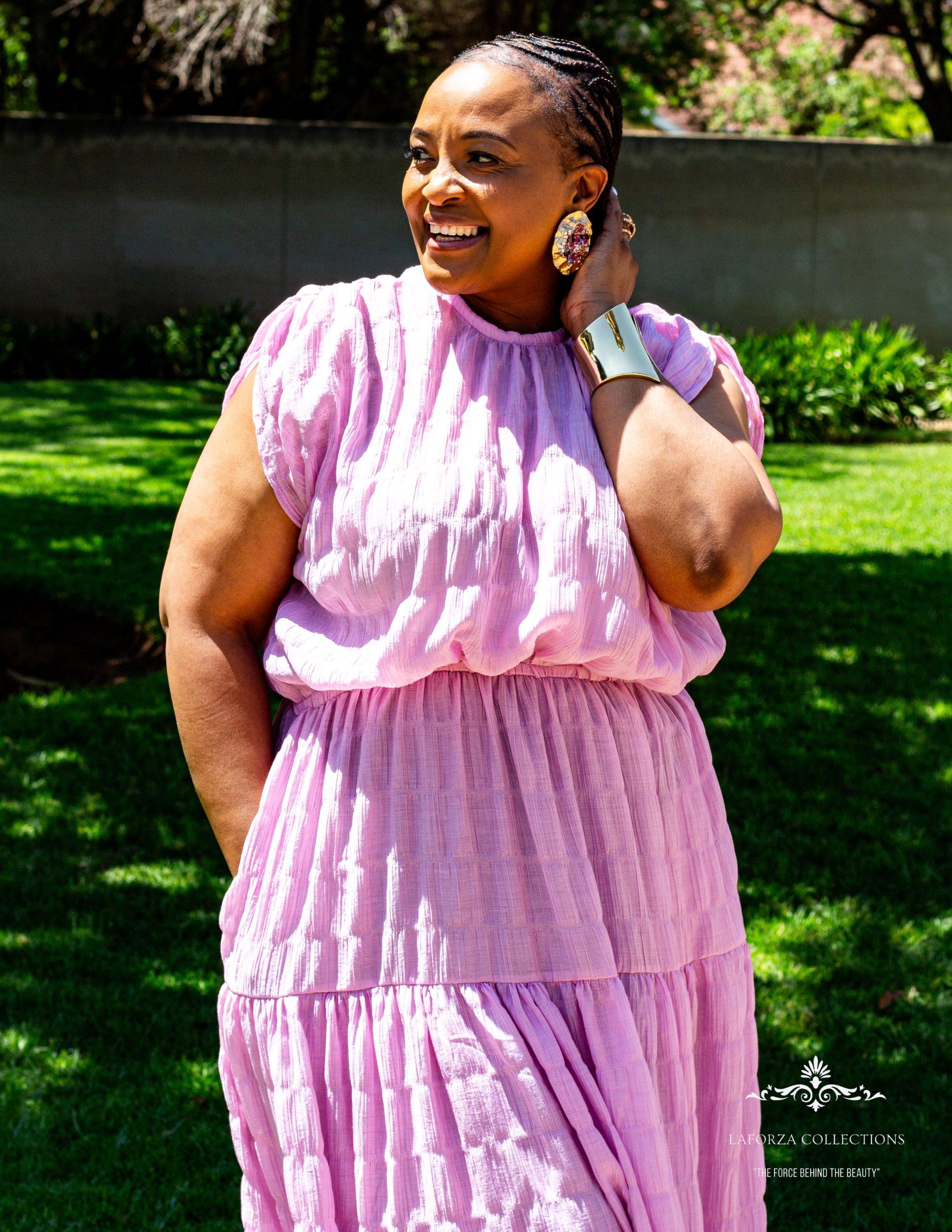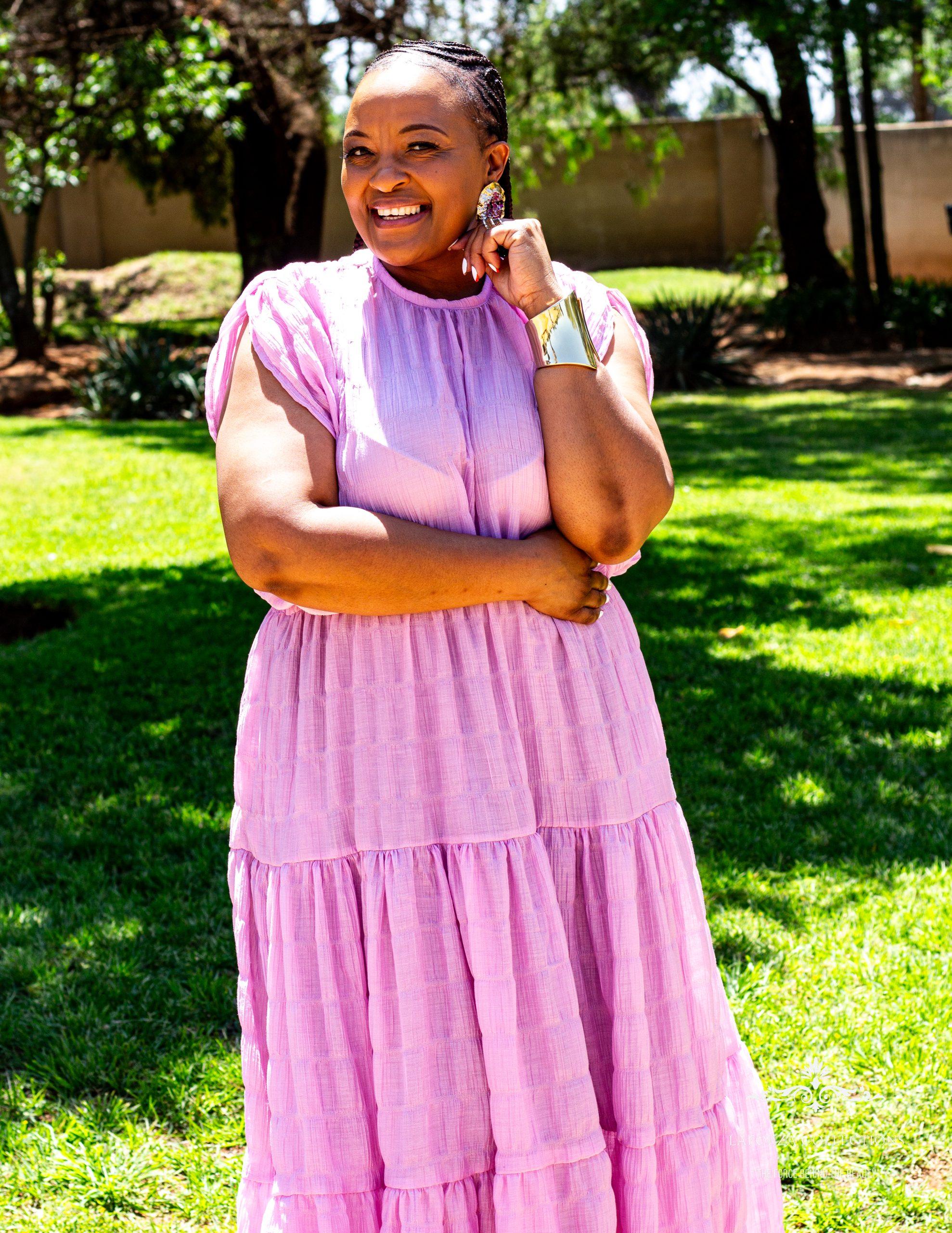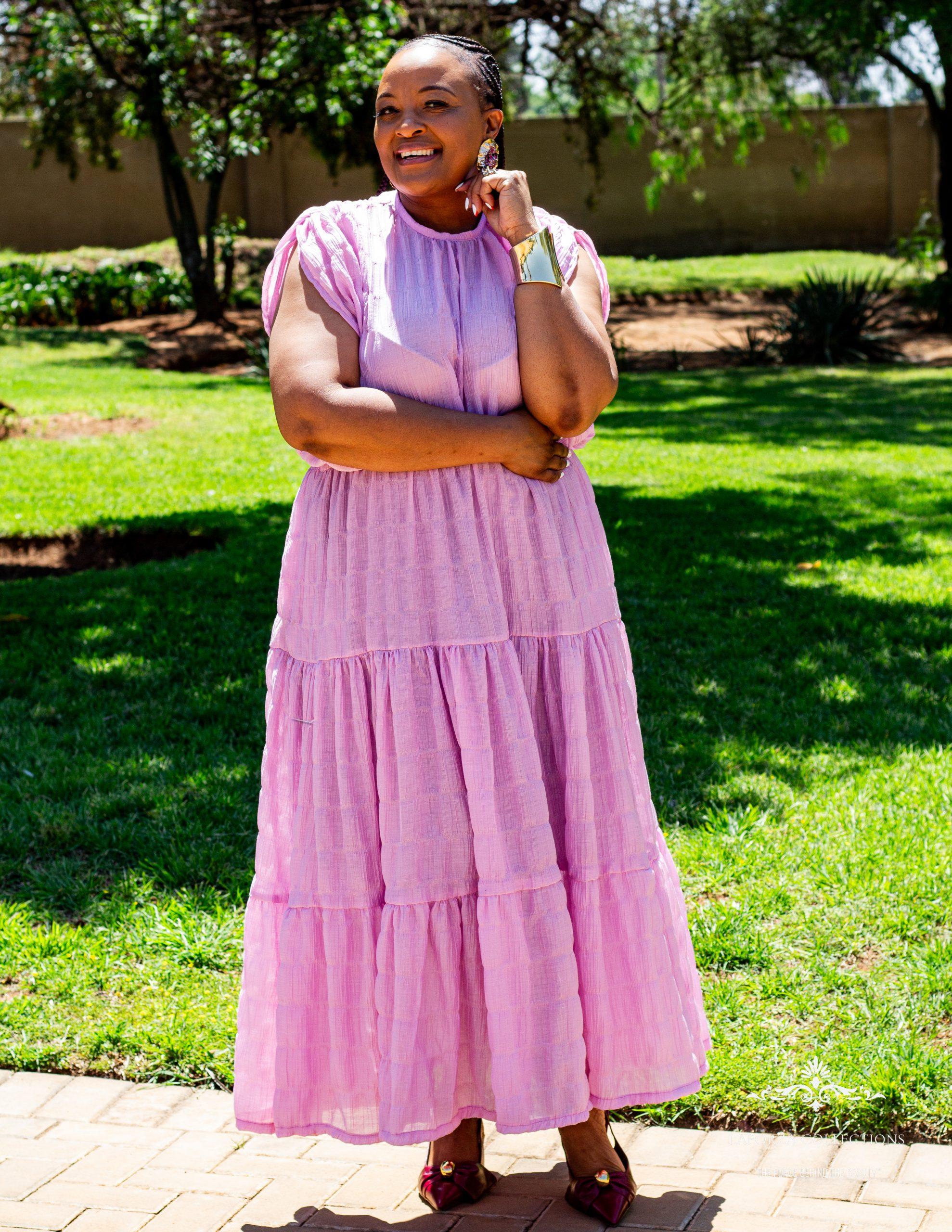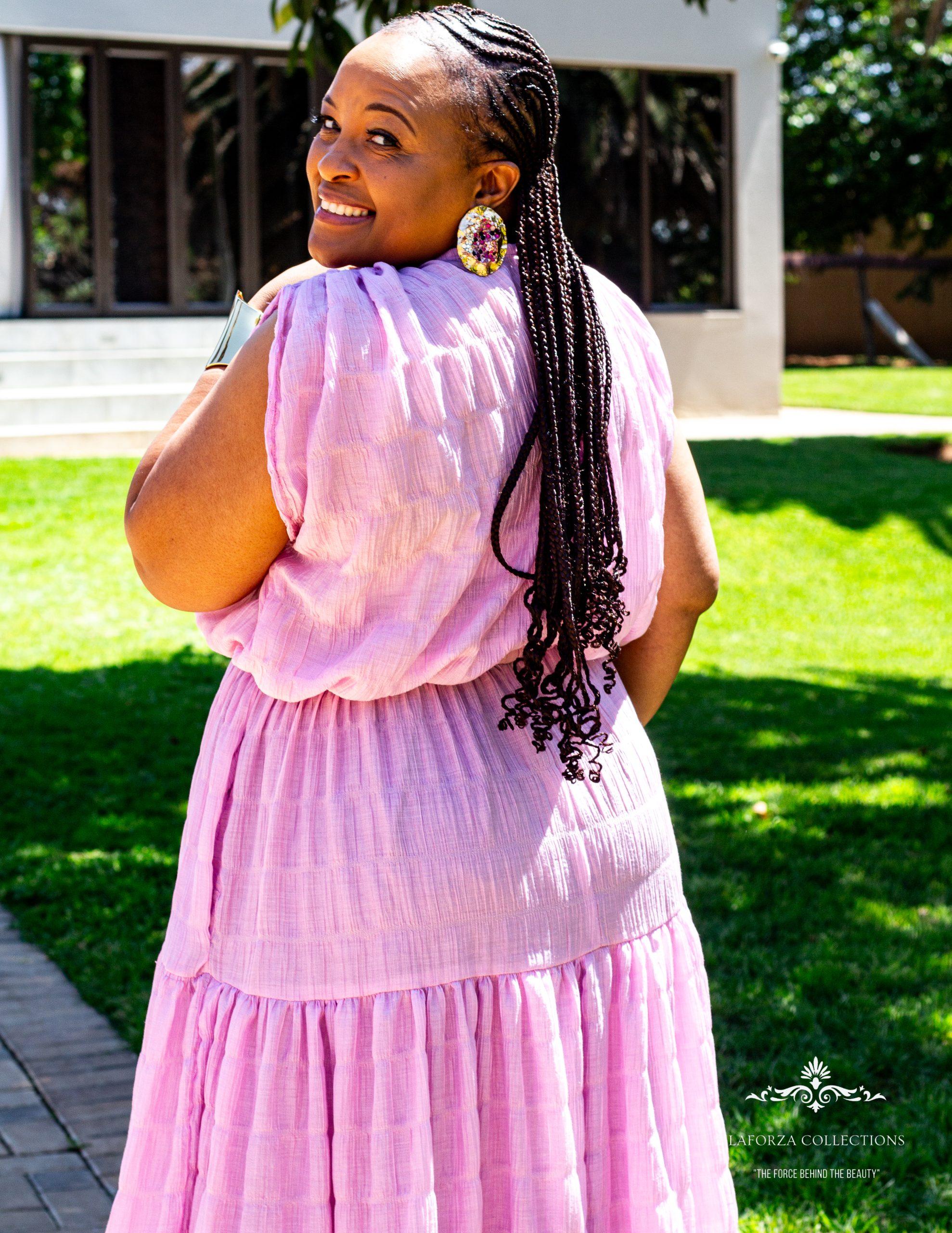 Our maxi length dress is designed with a round neck and a zipper at the back, slandering shoulder and gathered tiers from waist down for added volume.